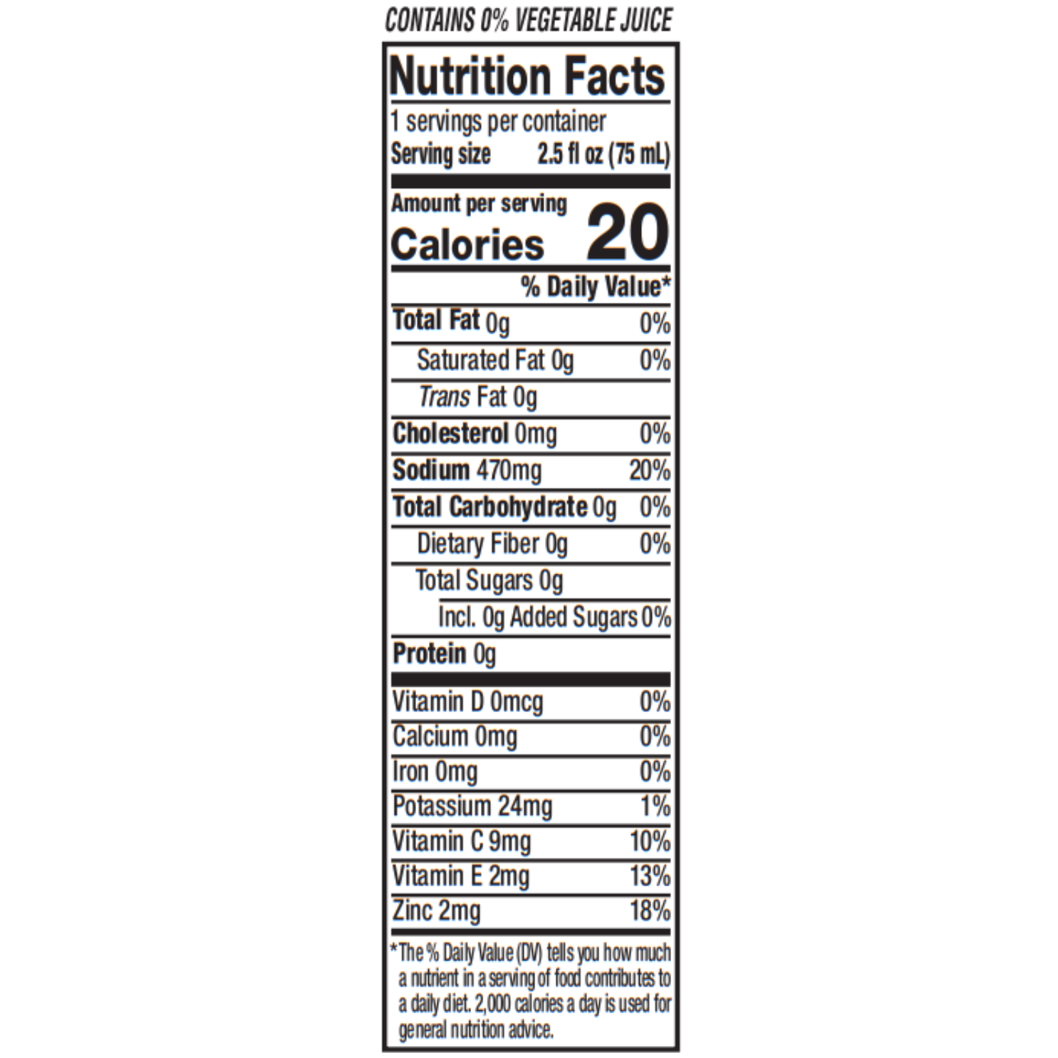 Extra Strength Pickle Juice Shots: serving size: 2.5 fl oz (75 mL) (1 bottle), servings per container: 1, Amount per serving: Calories: 0, Total Fat: 0g (0% DV), Cholesterol 0mg (0% DV), Sodium: 470 mg (20% DV), Potassium: 20mg (1% DV), Total Carbohydrate: 0g (0% DV), Sugars: 0g, Protein: 0g, Vitamin C (8% DV), Vitamin E (8% DV), Zinc: 2mg (13% DV). Percent daily values (DV) are based on a 2,000 calorie diet.